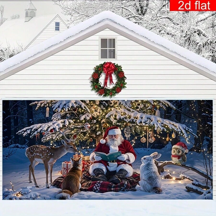 1 pieza Pancarta grande de poliéster para puerta de garaje, paisaje nevado invernal con Papá Noel y animales, durable y fácil de colgar, adecuada para decoración de pared en fiestas de Navidad y Año Nuevo