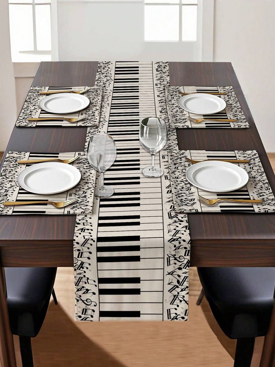 1 pieza Tapete de mesa impreso con teclas de piano y patrón geométrico; Juego de 4/6/8 manteles individuales impresos con teclas de piano y patrón geométrico - Adecuado para fiestas, cumpleaños, cenas, decoración de cocina y comedor, versátil para todas las estaciones y decoración del hogar