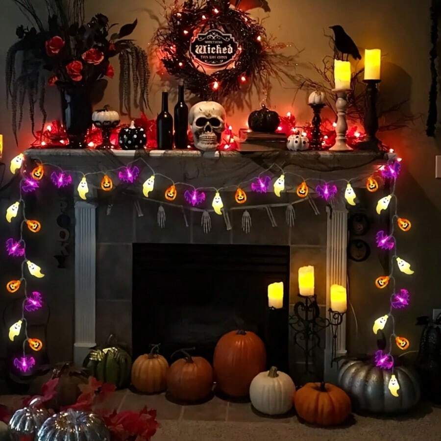 20 luces LED de cadena de Halloween (calabaza y murciélago) - Resistente al agua para interiores/exteriores, 8 modos con control remoto y temporizador, caja de baterías (baterías no incluidas) para ambiente festivo