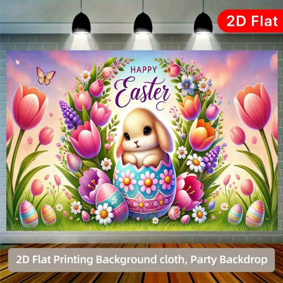 1 pieza de pancarta plana 2D, Fondo de fotografía de poliéster con conejito de Pascua y huevos para decoración de fiesta, cortina de puerta, suministros de cumpleaños, decoraciones de fiesta, adecuado para el hogar, jardín, patio, celebraciones de aniversario y accesorios fotográficos, de diseño plano 2D y multiusos