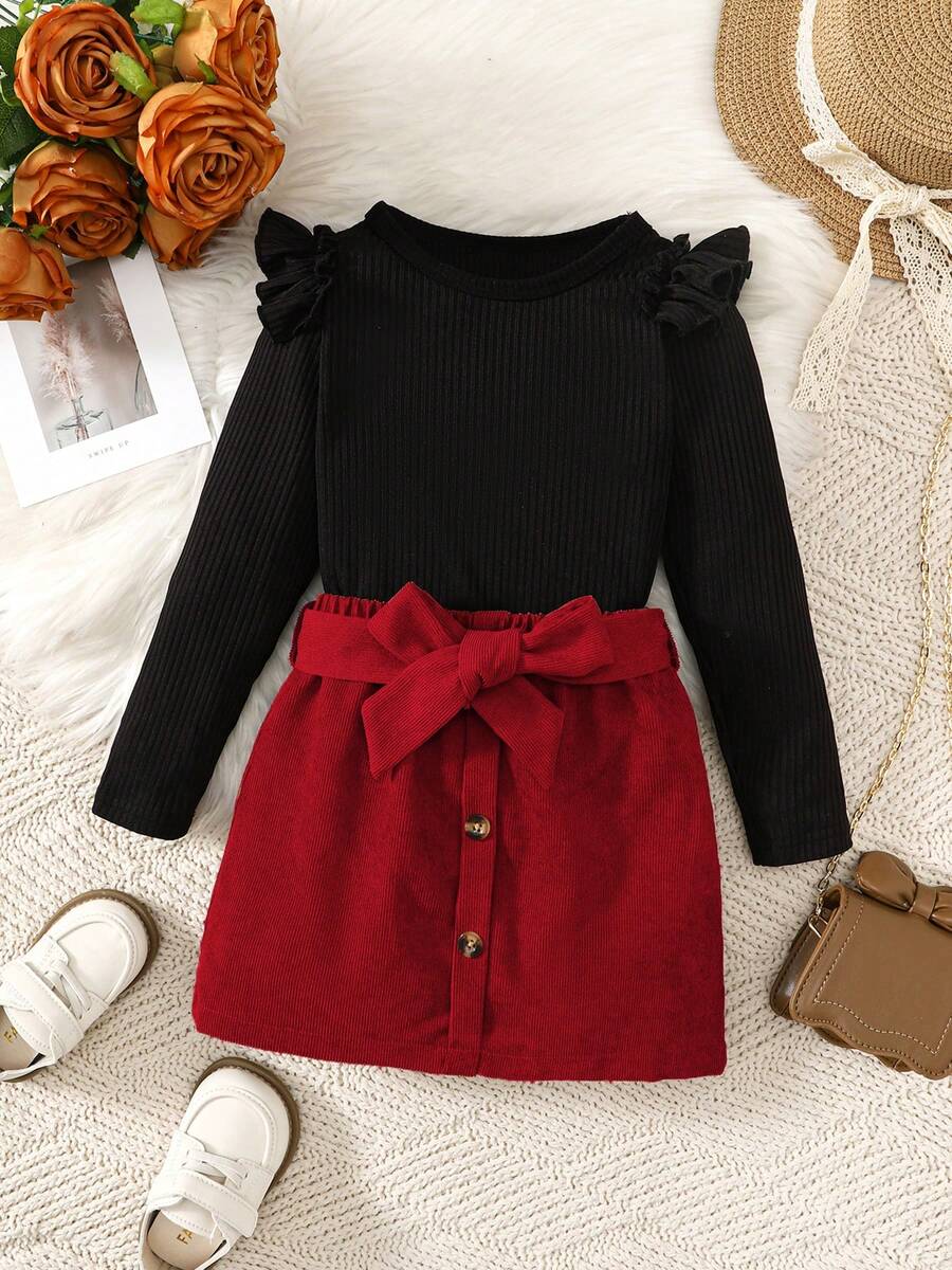 Conjunto de 3 piezas para niñas de 4 a 7 años: Blusa de manga larga con volantes negra, falda de pana de princesa con cinturón, conjunto de moda para uso diario, escuela, fiesta y otras ocasiones