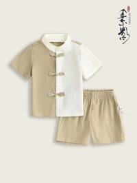 Conjunto de 2 piezas para bebés niños, estilo hanfu con Body de punto y conjunto de batas holgadas con diseño de botones, incluye Body y pantalones, adecuado para otoño/invierno, transpirable, estampado lindo, tela premium, sensación elegante de alta gama, versátil para uso diario, deportes, salidas casuales