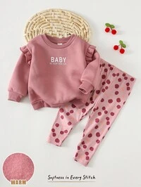 Cozy PixiesCozy Pixies 2 piezas Conjunto de sudadera con cuello de volantes estampada con letras y pantalones de cintura elástica para bebé niña, sudadera con cuello redondo y estampado de cerezas y pantalones, cómodo y versátil, estilo casual y sencillo, adecuado para interior, exterior, esquí, uso diario, deportes, fiesta, vacaciones en otoño/invierno, ropa deportiva para bebé, conjunto de bebé niña para otoño/invierno, ropa diaria para bebé niña, conjunto casual para bebé, conjunto con estampado de cerezas, ropa de bebé, ropa de bebé niña con estampado de fresa
