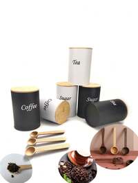 shoxil storeSet de 3 tarros de almacenamiento de café redondos, recipientes para café, té y azúcar con 3 cucharas para café, incluye tarros de metal blanco y negro con tapas de madera y sello hermético - Tarros de cocina con etiquetas grabadas, aptos para almacenamiento, restaurante, decoración, regalos para mamá, Día de la Madre, boda, regalos para papá, novio, novia