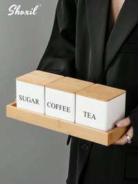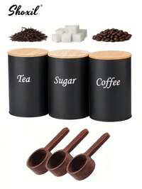 shoxil storeshoxil Juego de 3 botes de almacenamiento de cocina, con tapa de madera negra y latas de hierro para azúcar, té y granos de café sellados, regalos para café, té, azúcar, organización de cocina, comedor, sala de estar, sala de té, amigos y familia