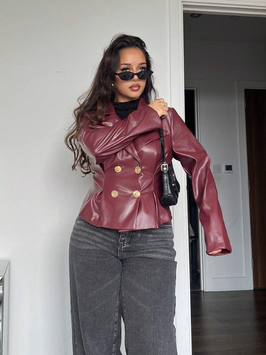 NegzBox Chaqueta minimalista de color contrastante, prenda exterior de manga larga para principios de otoño, abrigo burdeos, chaqueta elegante para mujer, atuendo para salir, ropa de mujer para Año Nuevo, ropa de Navidad, chaqueta de invierno para mujer, ropa de invierno para mujer, ropa de otoño para mujer, chaqueta estilo Ankora Old Money, chaqueta de PU rojo vino para ir al trabajo y casual elegante, chaqueta de PU con botones metálicos en la cintura