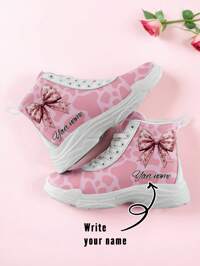 Botas altas de PU personalizadas para el Día de San Valentín, diseño de nombre personalizado, regalo romántico único para él y ella, lindo patrón de vendaje con corazones, impermeables, cálidas, cómodas y antideslizantes, perfectas para parejas, aniversarios u ocasiones especiales