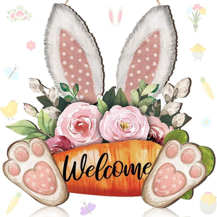 Coronas de Pascua para la puerta principal, colgador de puerta de conejito de Pascua, letrero de madera colgante para la puerta de 11.8 X 11.8 pulgadas, corona de bienvenida de conejo, letrero floral de Pascua para pared, porche, exterior, estilo rústico, decoraciones y regalos de Pascua para interiores