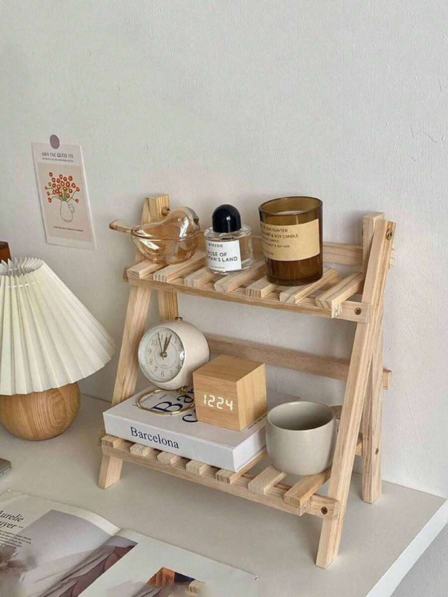 Estantería de escritorio plegable de madera hecha a mano, minimalista y de moda, estantería de exhibición de sobremesa trapezoidal de doble capa con barra transversal, adecuada para mesita de noche, tocador, decoración del hogar, almacenamiento de cocina, estantería de baño y accesorios de escritorio de oficina. Ideal para sala de estudio, dormitorio, dormitorio, como portavasos o para usar en cafetería y cocina.