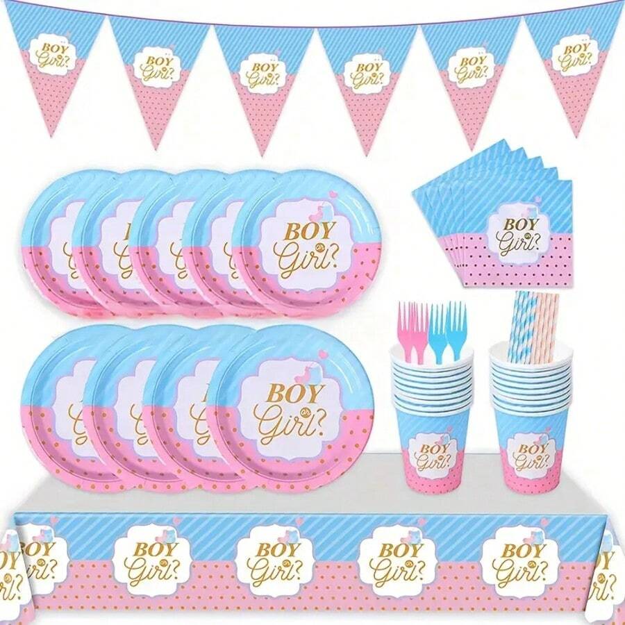 Juego de vajilla para fiesta de revelación de género Jonvell para 16 invitados: Platos, vasos, servilletas, pajitas y mantel de papel para niño o niña