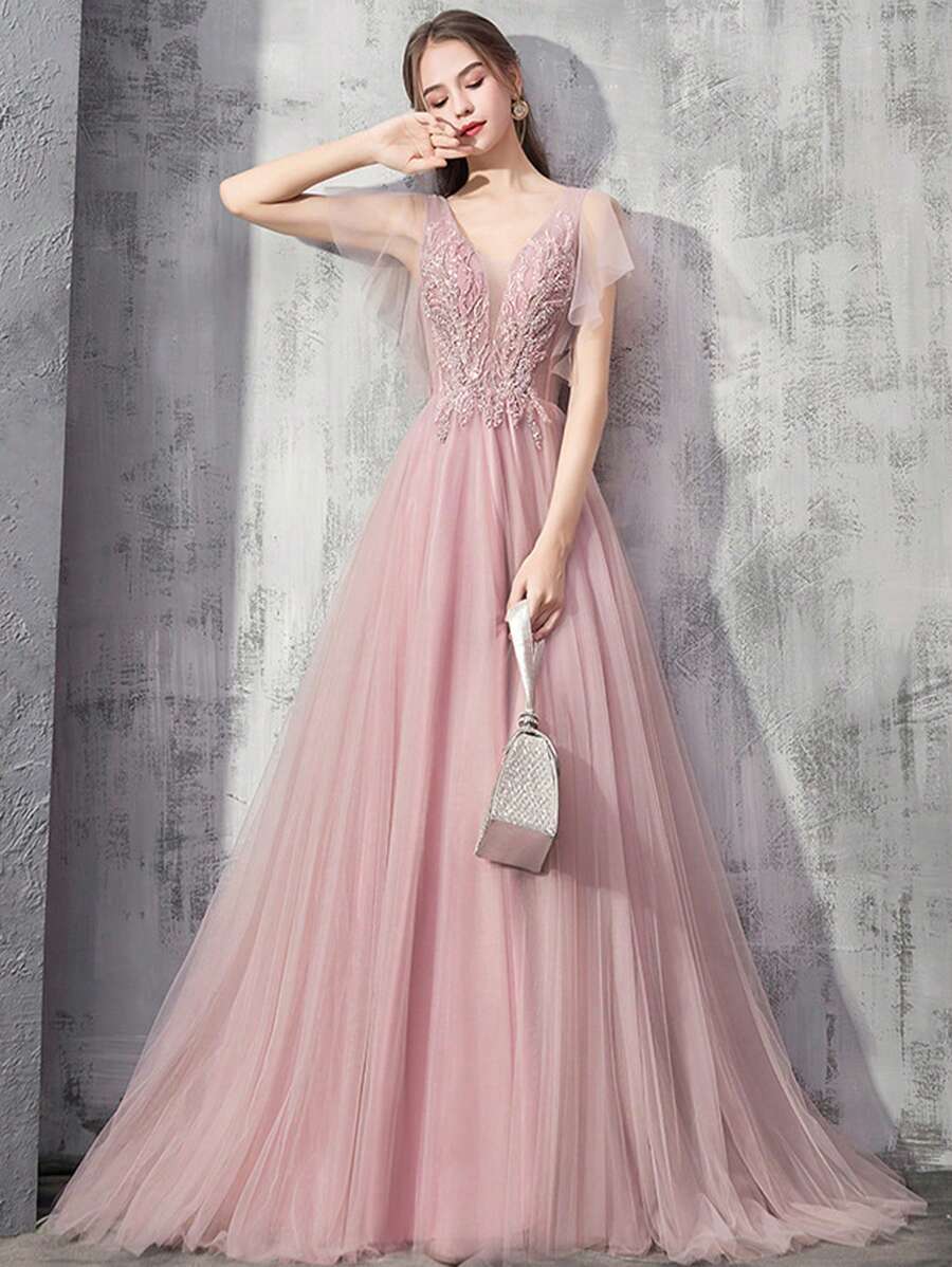 Nuevo vestido de noche elegante de color rosa dulce con escote en V, apliques de encaje, largo, para baile de graduación, cena, fiesta formal y vestido de invitado de boda