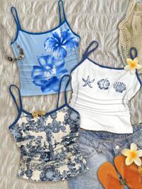 Maija KidsSHEIN Niñas preadolescentes Estatua de ángel azul francés con estampado floral, Acuarela floral crema y azul, Estampado con colocación de conchas azules, Tops de camiseta de contraste de verano, Estilo vintage retro, Estilo casual de vacaciones, Estilo, Lindo, Estilo Y2K Chica coco bohemia de vacaciones, Vibraciones de playa neón, Listo para el brunch de vacaciones de primavera, Viaje de chicas en azul bebé Conjunto de 3 piezas de camisetas sin mangas para niñas, atuendo casual y transpirable para verano, de vuelta al colegio, camisas para niñas, camisetas, ropa para niñas, camisas para mujeres, ropa, Ramadán, camisa de Ramadán, camiseta de Ramadán, ropa de Ramadán para niños, ropa de Ramadán para adolescentes, primavera, verano, otoño, invierno, a rayas, estilo americano, Festival de Ramadán, Eid Al-Adha