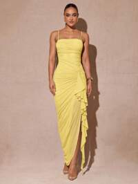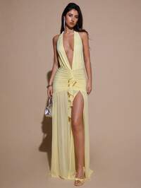 lacRéboSHEIN BAE Vestido maxi de mujer elegante, minimalista y sexy de color amarillo crema con cuello en V profundo, halter, ajustado, fruncido y de malla, adecuado para fiestas, cócteles, ocasiones formales, dama de honor, cumpleaños, Navidad, casual de negocios