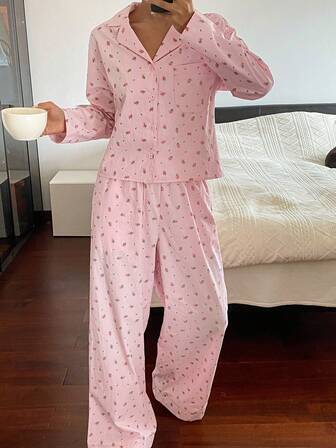 DAZY Conjunto de pijama con estampado floral diminuto - Top corto y pantalones, ropa de otoño