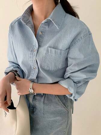 DAZY 1 pieza Camisa de manga larga de ajuste ceñido con cuello para mujer de unicolor