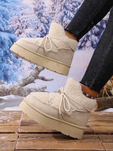 Botas de nieve casuales para mujer de suela gruesa y suave, con forro cálido, puntera redonda, decoración de cordones y tela de lana, cómodas y de moda, para uso en interiores y exteriores en otoño/invierno, color beige