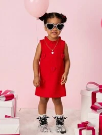 Vestido casual para bebé niña de unicolor con diseño de parcheado, cuello redondo, manga corta y estampado de corazón