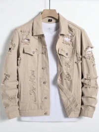 Manfinity Homme Chaqueta vaquera de manga larga con bolsillo con solapa y desgarros, sin camiseta, chaqueta vaquera de color caqui liso para fiesta, estilo grunge y rapero, para otoño