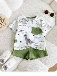 WimblieSet de 2 piezas para niños, Parte superior: Jersey de punto azul marino texturizado con gráfico bordado en rojo en el pecho izquierdo, Bottom: Pantalones caqui, Adecuado para ir y venir, la escuela, uso casual diario, primavera/verano, temporada de regreso a clases, Ropa de bebé niño, Set de suéter de bebé niño, Conjunto de bebé niño, Conjunto casual de bebé niño