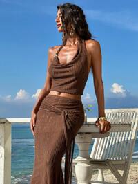 OpulessaOpulessa Conjunto de 2 piezas de top de halter de punto y falda de cintura baja para vacaciones de mujer, conjunto de falda para vacaciones, estilo de vacaciones, ropa de playa para mujer, ropa de mujer para otoño, conjunto de falda de 2 piezas para mujer, estilo casual de mujer, concierto, fiesta, club, ropa de mujer para otoño, elegante y sexy para citas nocturnas, atuendo para el Día Nacional, look de Año Nuevo, atuendo elegante para fiestas, atuendo de graduación, atuendo de baile de graduación