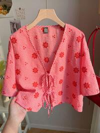 SerisseSerisse Camisa de mujer estilo francés de San Valentín, elegante, con rayas rojas, bordada, tipo babydoll con un lazo rojo en la espalda, estampado floral, mangas cortas, adecuada para primavera y verano. Blusa roja para mujer, para vacaciones, blusas elegantes para damas, blusa para salir, playa, San Valentín, blusa rosa con lazo para primavera y vacaciones