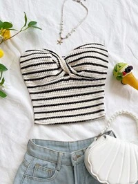 SoleiaSHEIN x Eduarda Gutierrez Soleia Conjunto de 2 piezas para mujer con top corto de punto a rayas y shorts ajustados de tiro súper bajo, atuendo adecuado para vacaciones, fiestas, Navidad, San Valentín, citas, playa, crucero, carnaval, Pascua, Año Nuevo Chino