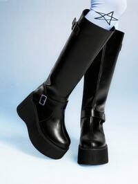 SugerpunkSugerpunk Botas altas de plataforma con suela gruesa de 4.0 pulgadas, estilo retro y sexy, punta redonda, cremallera trasera, circunferencia del eje de 13 pulgadas, altura del eje de 14 pulgadas, estilo gótico de calle, unicolor de PU, hebilla cuadrada de metal, doble correa, plataforma gruesa y cuña, adecuadas para exteriores, viajes y fiestas en otoño/invierno