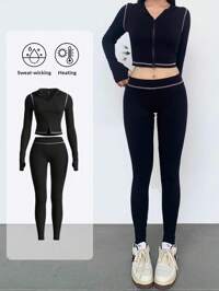 SHEIN BASICS Conjunto de 2 piezas con camiseta de manga larga de punto de cuello redondo en color liso ajustada y pantalones pitillo de talle alto para mujer