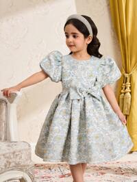 SHEIN Vestido de princesa de cuello redondo, manga corta, con lazo en la cintura, adecuado para fiestas, Ramadán y otras ocasiones, para niñas